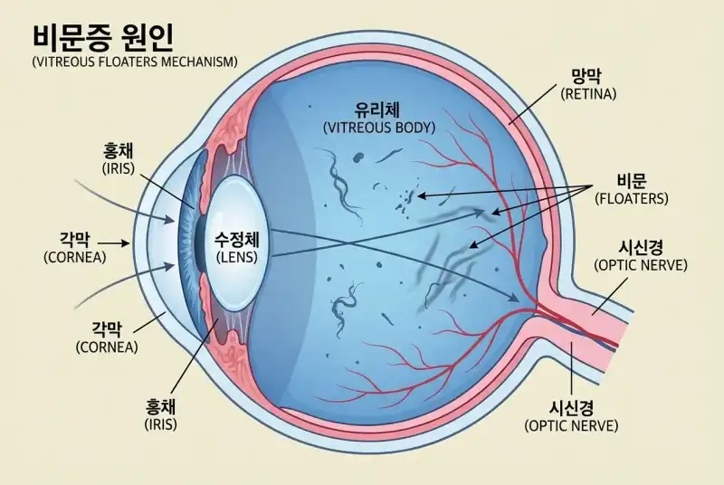 비문증은 눈앞에 먼지, 벌레, 거미줄, 검은 점, 아지랑이 같은 형태의 부유물이 떠다니는 것처럼 보이는 증상이에요. 서울아산병원 질환백과에 따르면, 우리 눈 속에는 “유리체”라는 투명한 젤리 같은 물질이 안구의 대부분을 채우고 있는데, 이 유리체에 변화가 생기면서 부유물이 만들어지는 거예요.
